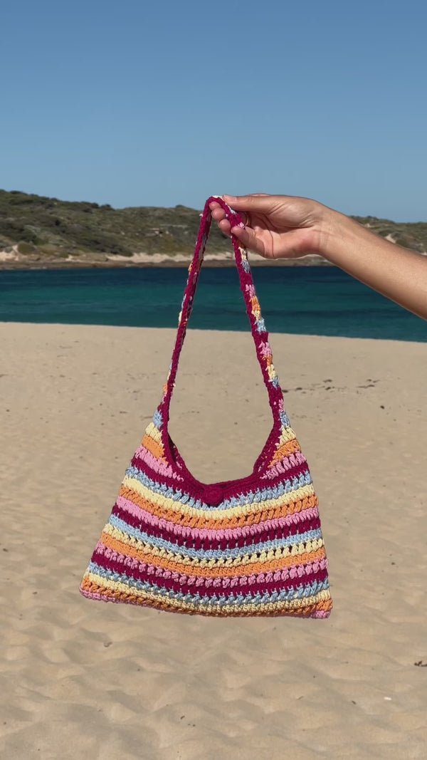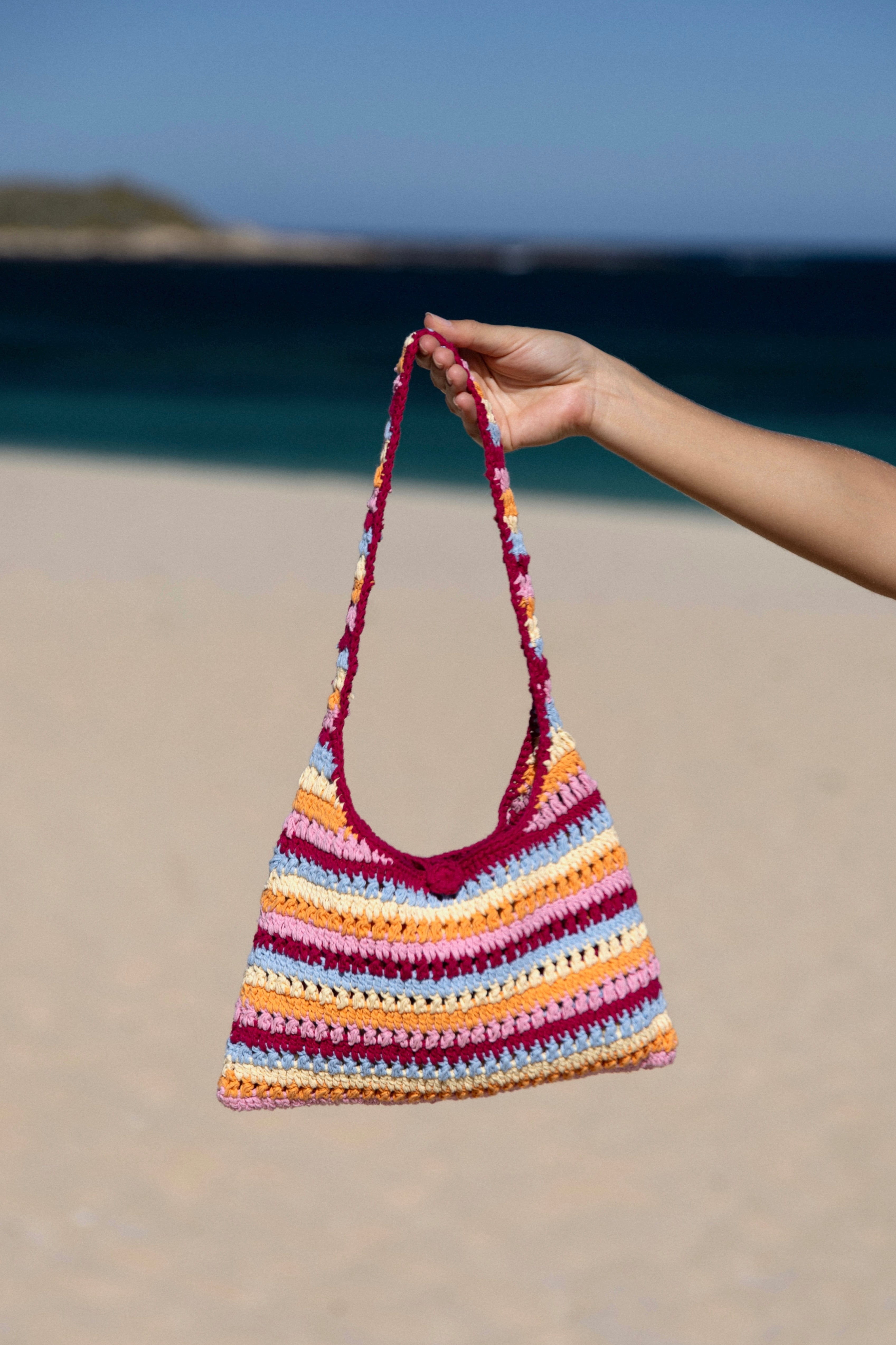 The Billabong Bag adds a colourful, coastal touch to any look, made with 100% cotton and colours inspired by a busy Australian coastline on the day of a Heatwave. Lightweight yet durable, this crochet bag carries all of your small beach essentials - like your phone, sunscreen, and keys - making it the perfect summer accessory from beach to bar and everywhere in between.